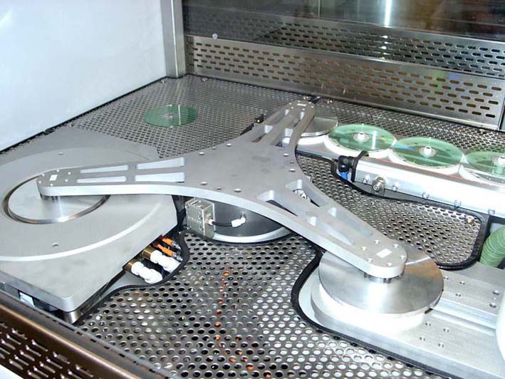 Для производства CD-R завод оснащен швейцарским оборудованием компании 4M — MultiMedia Masters & Machinery. Швейцарцы осуществляют на заводе не только настройку оборудования и программного обеспечения линии, но и постоянный контроль качества продукции. Во время моего визита как раз присутствовали двое швейцарцев. Один из них осуществлял настройку оборудования, благодаря чему мне довелось сфотографировать внутренности станка.
