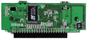 Открутив два болта, мы попадаем внутрь устройства, а там… практически ничего нет :) Только место для стандартного винчестера диаметром 2.5″ да основная платка, в которой и заключен весь смысл устройства — на ней расположены микросхемы моста USB-IDE.
