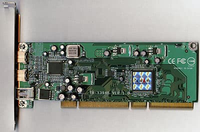 Плата достаточно длинная, что, впрочем, обусловлено не ее сложностью, а интерфейсом PCI64. Совместимость его с обычной PCI полная, чем я и воспользовался. Зачем нужен более широкий интерфейс, если даже в пике FireWire 800 может обеспечить лишь 100 Мбайт/с., а PCI (пусть в теории, но и в первом случае она же) выдает до 132 Мбайт/с.? Во-первых, на эту ПС желающих много, во-вторых, порта у нас все-таки два :) Третий — обычный 6-ти контактный разъем для обеспечения совместимости с рассчитанными на первый вариант шины устройствами (разумеется, на скорости до 400 Мбит/с.). По информации от производителя, построен адаптер на связке из двух микросхем: TSB82AA2 и TSB81BA3. Этот чипсет от Texas Instruments на данный момент является наиболее популярным среди производителей разного уровня, так что его можно встретить и на изделии от Tekram, и на чем-нибудь от «неизвестного солдата» (цена, кстати, все равно практически одинаковая). Большим минусом TR-1394B следует считать отсутствие разъема для дополнительного питания — в этом случае адаптер по стандарту выдает лишь 0.4 А 12 В, т. е. чуть менее 5 Вт мощности. Сравните это с максимально возможными по спецификациям 18 Вт (1.5 А при тех же 12 В) обычного FireWire или 45 Вт IEEE1394b! Фактически, второго значения уже достаточно для питания ВЖД на пластинах диаметром 3.5″ , а без питания остается от этого жалкие 10% :( С другой стороны, повод для обиды скорее виртуальный — производители различных FireWire-устройств прекрасно осведомлены о наличии на рынке огромного количества PCI-контроллеров без дополнительного питания, так что все, что требует больше 5 Вт, предпочитают кормить своими силами. Посмотрим, что будет по мере внедрения PCI Express, который прямо от шины способен обеспечить до 75 Вт, чем наверняка воспользуются производители FireWire-контроллеров, что ускорит и среди производителей устройств отказ от собственных БП, но это будет нескоро.