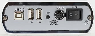Все остальное сконцентрировано на противоположной («задней») грани: USB-разъем типа B для подключения к компьютеру и два типа А для присоединения какой-либо периферии, кнопка быстрого выполнения копирования информации, разъем питания типа mini-DIN и выключатель. Единственное, к чему есть претензия, — кнопку Back Up сложно назвать удачной. Во-первых, все-таки ее место на той стороне, которая должна быть повернута к пользователю. Во-вторых, она слишком утилитарно мелкая. В случае более мелких накопителей на базе 2.5″ винчестеров особого выбора не бывает, но здесь конструкторам было, где разгуляться! Вариант ViPower (где кнопка спереди, большая и подсвечивается) нам нравится больше.