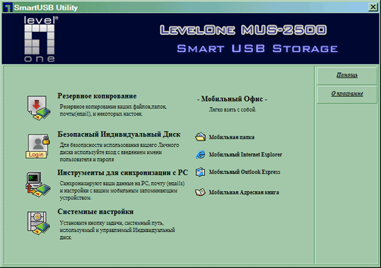 Знакомство с программой (в версии для внешнего модуля она называется Smart USB, а не SmartFlash, что логично) начинается сразу после подключения накопителя к USB-порту компьютера. Встроенный «флэшдрайв» разбит на две части. Одна из них системе «представляется» как виртуальный CD-ROM, вторая — как собственно флэш-накопитель. Сделано это по двум причинам — во-первых, для CD есть автозапуск (то есть штатная программа может быть запущена сразу при подключении устройства), во-вторых, он по-умолчанию защищен от записи (так что «загрузочный модуль» программы и утилиту восстановления «основного» удалить нельзя). Большая часть ПО, немудрено названного SmartFlash Utility, вместе с данными пользователя расположена на основной части флэшдрайва, что позволяет обновлять ее, при необходимости (там, кстати, остается еще свободными порядка 11 мегабайт места, которыми можно воспользоваться по личному усмотрению — например, еще какие-нибудь программы с собой носить). А что будет, если пользователь случайно или нарочно отформатирует эту часть, либо вручную удалит нужные файлы? Да ничего страшного — данная ситуация будет отловлена «загрузочным модулем», который предложит восстановить все остальное из архива на защищенной части Пусть и в том виде, который был при покупке, то есть апдейты ПО нужно будет сделать вручную.