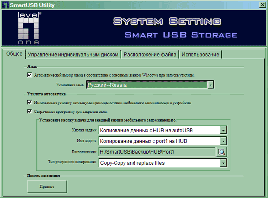 А последняя утилита является настроечной. Все ее возможности распределены по нескольким вкладкам. Первая посвящена общим настройкам — языку программы, параметрам автозапуска и т. п. Здесь настраивается и функция аппаратной кнопки, которая есть у накопителя, как и у рассмотренного ранее флэшдрайва. На ее нажатие можно «повесить» синхронизацию одной из пары папок (наиболее правильным будет, на наш взгляд, выбрать «Мои документы»), запуск выбранной задачи резервного копирования или быстрое резервное копирование содержимого накопителя, подключенного к одному из портов хаба на внутренний жесткий диск. В замешательство нас привел выбор одного из трех портов, хотя внешних всего два. Потом мы поняли, что содержимое встроенной «флэшки» тоже можно сбросить на диск, полезность чего сомнительна (так что лучше бы это и не делали). Вторая закладка позволяет работать с защищенным диском, если он создан: изменить имя пользователя и/или пароль для доступа или удалить. Последняя закладка предназначена для сервисных функций, типа обновления набора штатного программного обеспечения или восстановления его в исходном (послепродажном) состоянии.