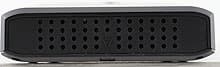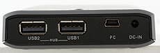 Все разъемы сконцентрированы на коротком торце, противоположном вентиляционному. В данном случае их четыре штуки: два USB-порта А-типа для подключения внешней периферии, один порт mini-B для подключения устройства к компьютеру и круглый разъем для подключения дополнительного питания. Стоит отметить, что, несмотря на более сложную, чем у конкурентов внутреннюю «начинку», накопитель у нас не отказывался работать всего от одного USB-порта. Во многом он обязан этому интеллектуальности современных USB-хабов, не подающих напряжение пока соответствующий порт не используется. Впрочем, при подключении дополнительных устройств «подпитка», наверняка, потребуется, причем много потребляющую периферию к встроенному хабу лучше не подключать все равно: питания с двух портов USB на три винчестера, например, не хватит. В этом плане устройство проигрывает аналогам на 3.5-дюймовых дисках: там, в комплекте есть мощный БП, обеспечивающий немалый запас питания. БП можно подключить и тут, благо разъем специально сделан универсальным, однако в комплекте его нет.