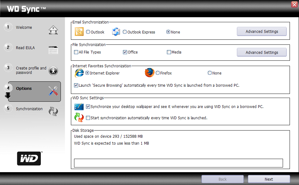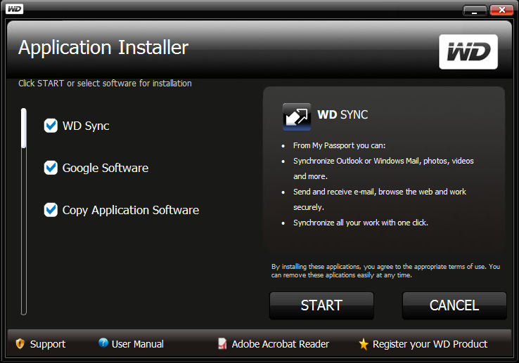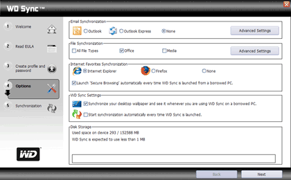 И наиболее интересным программным компонентом комплекта поставки устройства является программа WD Sync, не требующая инсталляции и запускаемая прямо с ВЖД. При первом ее запуске на незнакомом программе компьютере нужно лишь провести некоторые настройки, что программа любезно и предлагает сделать. Заодно можно установить на компьютер набор бонусных приложений от Google (ничего особо интересного собой не представляющий), а также сохранить резервную копию имеющегося на My Passport ПО на жесткий диск компьютера. Последнее имеет смысл сделать прежде, чем начинать что-то творить с устройством . Впрочем, WD Sync можно скачать и позднее с сайта компании, но предварительно зарегистрировав там устройство. Несмотря на последнее, данный подход импонирует нам куда больше, чем исповедуемый Seagate: там резервную копию при первом запуске создать никто не предлагает, а загрузить ПО с сайта можно, только обратившись в службу технической поддержки.
