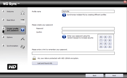 Настройка программы осуществляется простым и давно привычным образом — при помощи пошагового мастера. Первый шаг показан выше, на втором нам предлагают прочитать лицензионное соглашение и согласиться с ним, а, начиная с третьей закладки, появляется самое интересное — настройка профиля для синхронизации с компьютером. Следует отметить, что руководство пользователя подчеркивает, что WD Sync является программой синхронизации данных в чистом виде, но не может служить утилитой для резервного копирования информации. На деле, перебдели — может. Правда, очень простой и незамысловатой — нет накопительного копирования, нет возможности хранения нескольких версий файлов, но главную часть работы программа все-таки выполняет: при ее использовании вы будете иметь две копии важных данных, а не одну (чего во многих случаях достаточно). А каких данных — нам и следует выбрать. Но для начала мы просто создаем профиль синхронизации (их может быть много — по числу компьютеров) и защищаем его паролем, длиной не менее шести символов. При записи на портативный винчестер вся информация шифруется по алгоритму AES со 128-и разрядным ключом — на практике этого обычно достаточно. Оригинальным образом выглядит защита придуманного пароля от подглядывания — его можно набрать на виртуальной клавиатуре, каждый раз генерируемой по-разному.