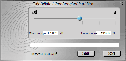 С ее помощью мы выбираем размеры открытого и защищенного разделов. Внешний вид программы, а также проблемы с локализованными версиями Windows что-то сразу напоминают... И не случайно напоминают: мы уже сталкивались с этим ПО (следовательно, и с данной моделью сканера), когда изучали флэшдрайв Apacer HandySteno AH620. Поэтому подробно описывать саму процедуру «обучения» программы распознавать пальцы, а также последующего использования накопителя мы не будем — все с достаточным количеством скриншотов рассказано в соответствующей статье. Остановимся лишь на отличиях.