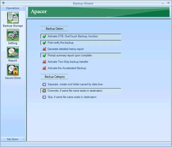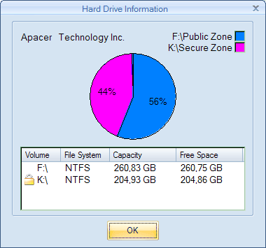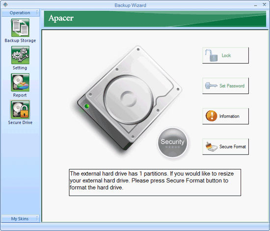 К каждому накопителю (как и ко многим SD-картам и флэшдрайвам компании) прилагается бесплатная двухмесячная лицензия Norton Internet Security 2009. Саму программу можно скачать с сайта Apacer — нужно только серийный номер устройства на специальной страничке ввести. Также на комплектном диске есть программа Backup Manager, период использования которой не ограничен :) Все, что она делает — обеспечивает возможность резервного копирования данных при помощи кнопки на корпусе, настраивает этот процесс, а также позволяет разбить накопитель на открытую и защищенную части.