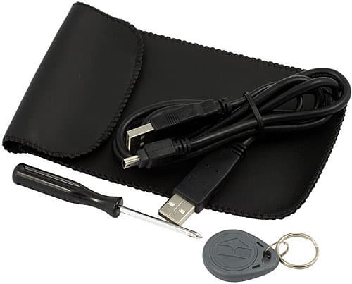 Что уже стало традиционным, в комплект входит Y-образный USB-кабель, позволяющий питать накопитель от двух USB-портов одновременно (при наличии таковой необходимости). Кроме него в коробке можно обнаружить три винтика (как мы уже выше сказали, при сборке устройства используются только два из них, так что один — про запас), отвертку и простенький чехол (дабы не портился внешний вид — пластик верхней части весьма восприимчив как к грязи, так и царапинам). Интересным компонентом являются наклейки-напоминалки о емкости собранного ВЖД: от 20 до 160 ГБ по две штуки каждого «номинала». С одной стороны, достаточно оригинальный шаг, с другой же — компания явно заказывала их очень давно, поскольку в противном случае ряд бы только начинался со 160 ГБ, а не заканчивался этой цифрой (ну а найти винчестер с SATA-интерфейсом всего на 20-30 ГБ так и вообще сложно — даже специально если искать). Еще в комплекте есть два внешне одинаковых RFID-ключа — самая интересная часть набора.