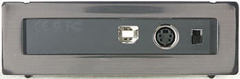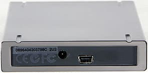 Вид спереди такой же, как у Mobile Hard, только размеры другие. Задний же торец изменился кардинально. Вместо mini-USB применяется вполне стандартный B-разъем. Рядом с ним расположен мощный разъем типа mini-DIN для подключения блока питания. Собственно, это слабое место всех накопителей на базе 3.5″ винчестеров: кроме напряжения 5 В, им требуется и 12 В, так что приходится навсегда забыть о возможности питания по USB, а достаточно большая сила тока при старте не позволяет питаться даже от FireWire, хотя там 12 В есть (недаром в GigaWare/FireWire800 максимальная сила тока увеличена). Выход один — использовать достаточно мощный блок питания, а значит, и работать с накопителем только в пределах прямой досягаемости розетки. А рядом с входом БП расположен простой выключатель питания: нет смысла зря тратить электричество и нагревать винчестер в те моменты, когда он не нужен.