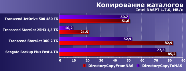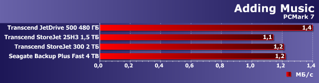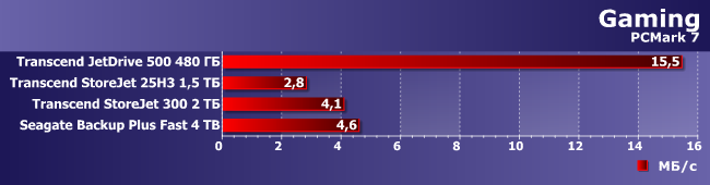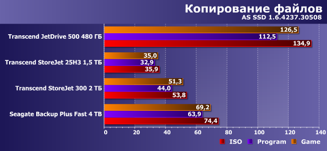 Вот как раз случай, когда Seagate Backup Plus Fast выглядит лучше всех при записи данных. Впрочем, как мы уже знаем есть внешние флэшки, которые работают быстрее, чем JetDrive 500, что смазывает радость от победы над ним. Да и вообще при такой нагрузке очень многое зависит от оптимизации ПО контроллера и винчестера (или SSD), что способно нивелировать различия между разными носителями данных и/или их организацией в конкретном устройстве.