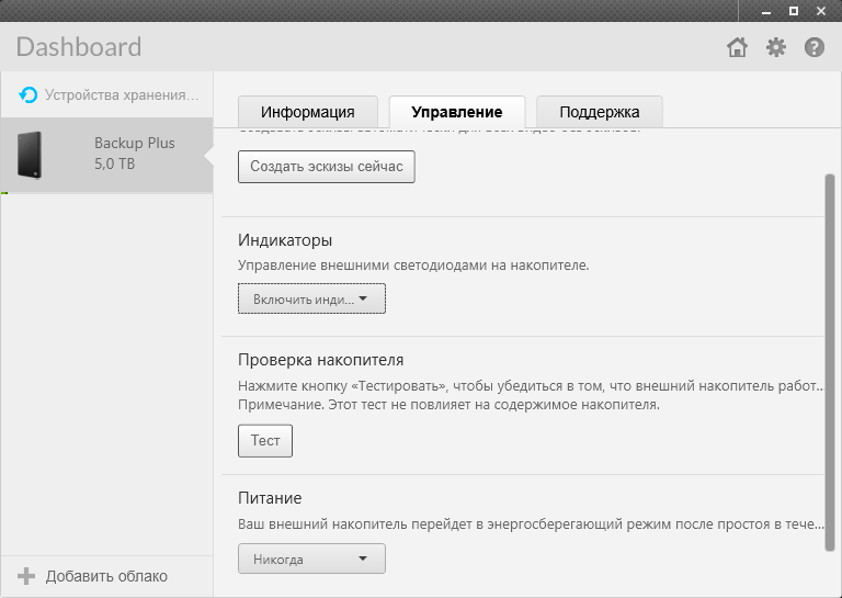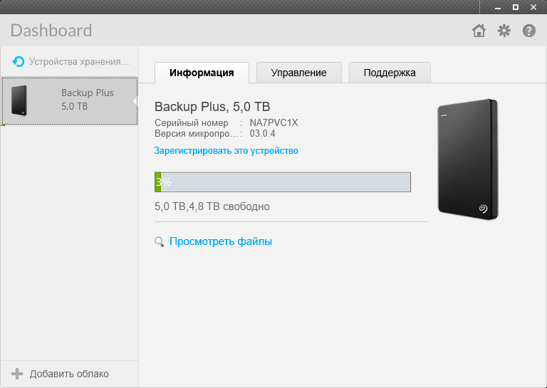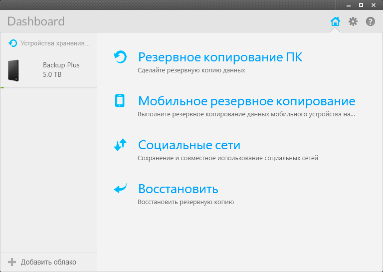 В отличие от комплекта программ WD, действительно являющегося комплектом, у Seagate все упаковано в одну утилиту. Как видим, резервное копирование файлов с компьютера и их восстановление — лишь половина ее функций.