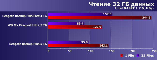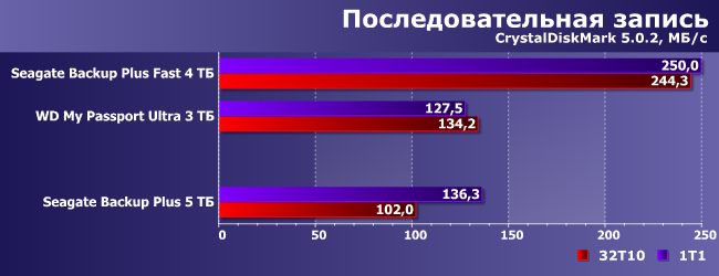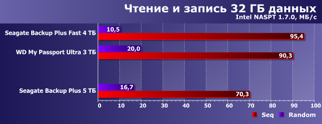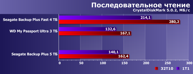 С кем накопитель сравнить? Оба наиболее интересных «конкурента» уже были упомянуты в начале статьи: Seagate Backup Plus Fast и WD My Passport Ultra 3 ТБ. Почему в кавычках? Потому, что первый конкурентом в полном смысле слова не является — это устройство немного более другого класса: более быстрое, но и потенциально более проблемное. My Passport, напротив, в полной мере конкурент, но лишь тогда, когда речь идет об объемах до 4 ТБ — «пятерок» у WDC пока в продаже нет (что интересно, Seagate на данный момент в свою очередь не предлагает «тритеров»). Но и более «мелкие» винчестеры Seagate тоже будут вести себя немного по-другому, так что сравнивать скоростные показатели «в лоб» не совсем правильно. С другой стороны, «битва за десятые» в тестах сама по себе не слишком важна, а какие-то более общие зависимости можно найти и при таком непрямом сравнении.