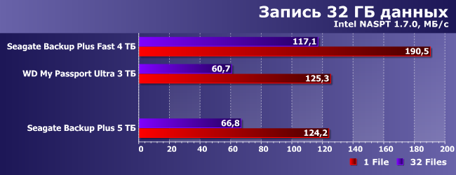 Как мы уже не раз писали, если уж «рабочие» нагрузки на первом месте, то именно для этого внешние SSD и придуманы. Винчестеры же по понятным причинам в таких сценариях работают намного медленнее. С другой стороны, вполне справляются с ними, а, если уж емкий накопитель приобретен для мобильного использования, вовсе не обязательно приобретать еще один быстрый. На текущий же момент важнейшим для нас является то, что для продукции WD такие нагрузки менее противопоказаны — Backup Plus Fast имел некоторую фору за счет конструкции, однако в Backup Plus «без Fast» ее нет. И сразу все встает на свои места :)