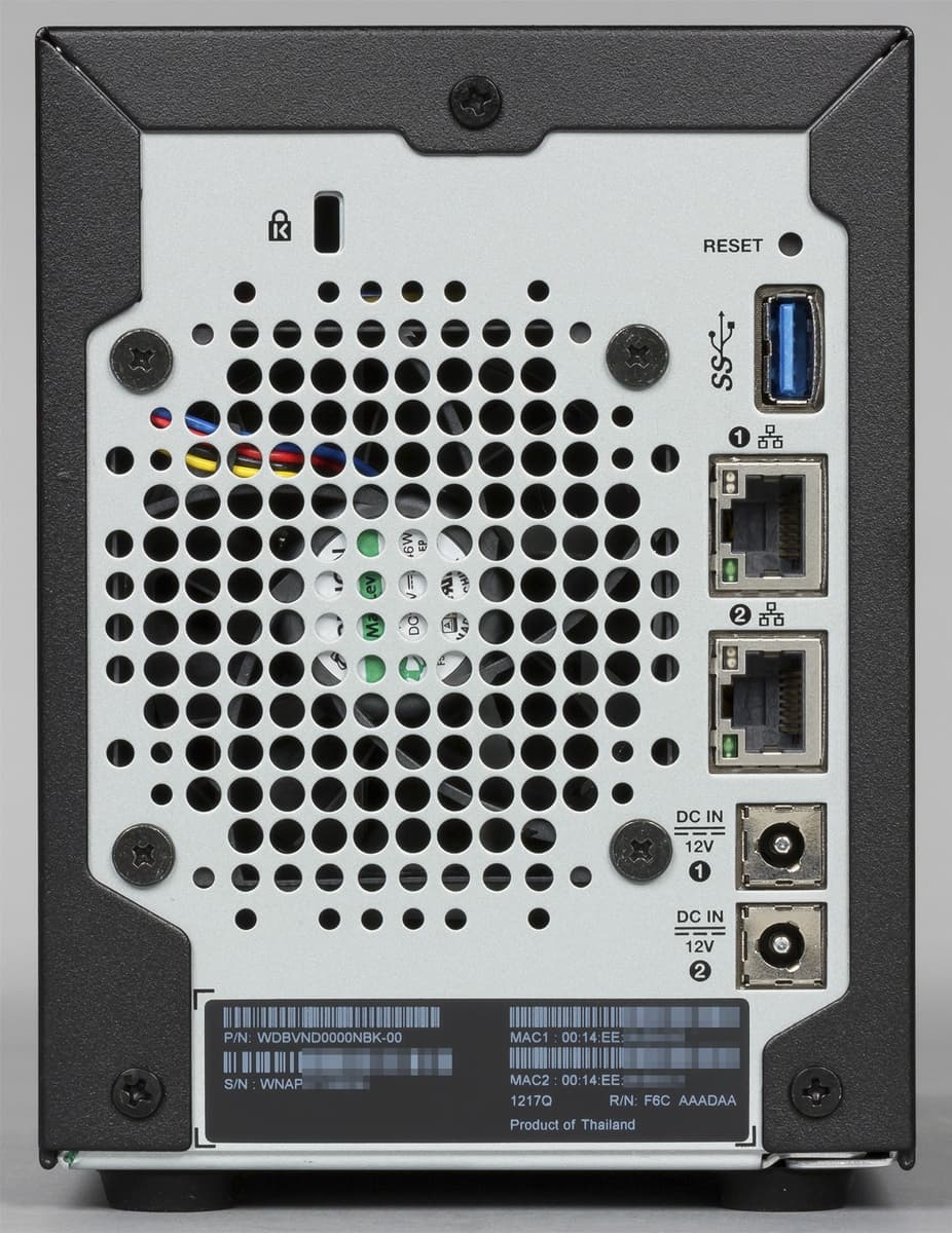 На дверцах, а также левой боковой стороне корпуса можно заметить решетки системы вентиляции. Основной ее элемент — вентилятор формата 70×25 мм установлен на задней панели. Здесь же мы видим все остальные порты: один USB 3.0, два гигабитных сетевых порта со встроенными индикаторами, два входа для блоков питания. Также присутствуют кенсингтонский замок и отверстие скрытой кнопки сброса.