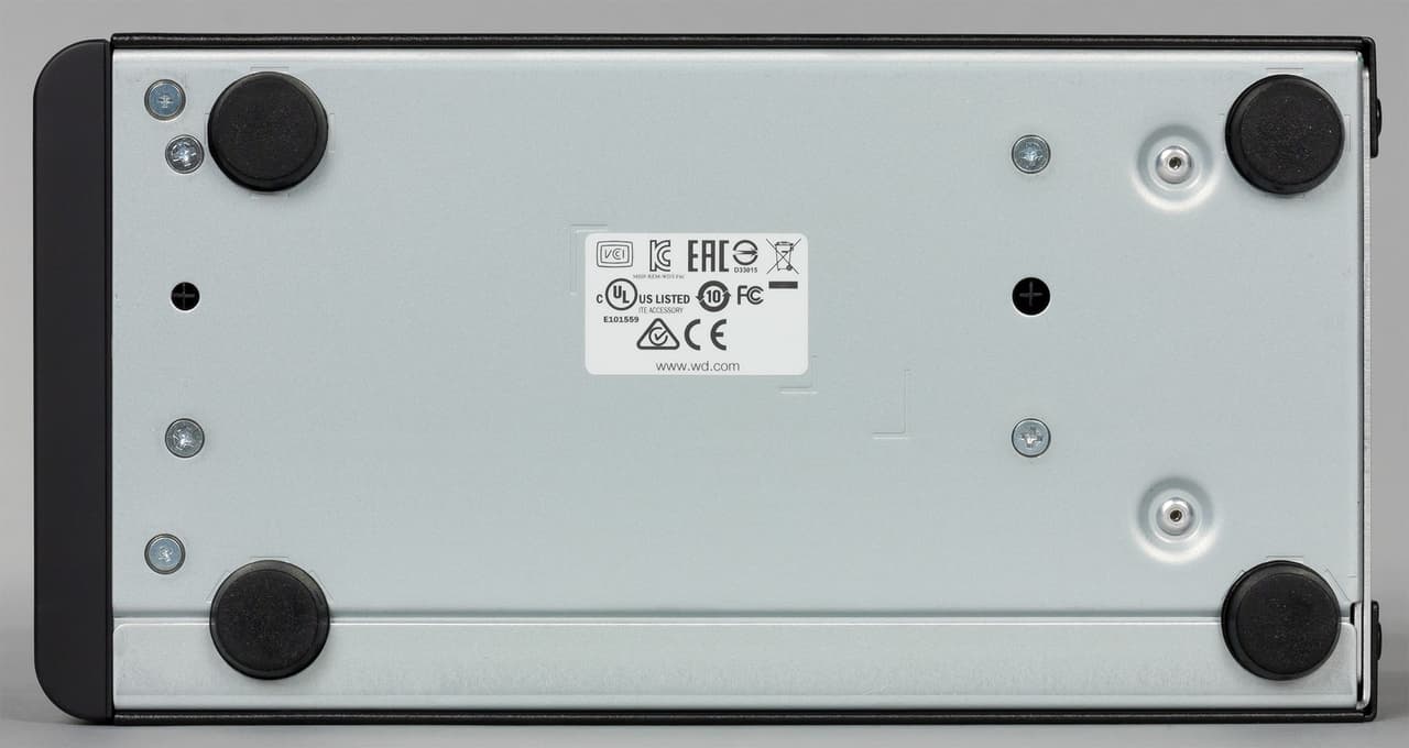 На дне установлены крупные резиновые ножки, что позволяет накопителю крепко стоять на столе. Заметим, что решеток вентиляции здесь нет, что снижает количество пыли внутри корпуса.