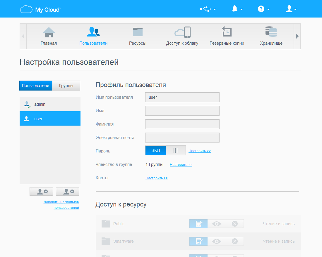 Раздел «Пользователи» используется для управления аккаунтами пользователей и групп. Для пользователя можно сразу же указать адрес электронной почты, который будет использоваться для облачного доступа к накопителю. Кроме того, для каждого дополнительного аккаунта автоматически создается и одноименная персональная общая папка. При необходимости вы можете ее в дальнейшем удалить или изменить права доступа. Заметим, что здесь реализована работа с дисковыми квотами как для пользователей, так и для групп. Права администратора делегировать другим пользователям нельзя.
