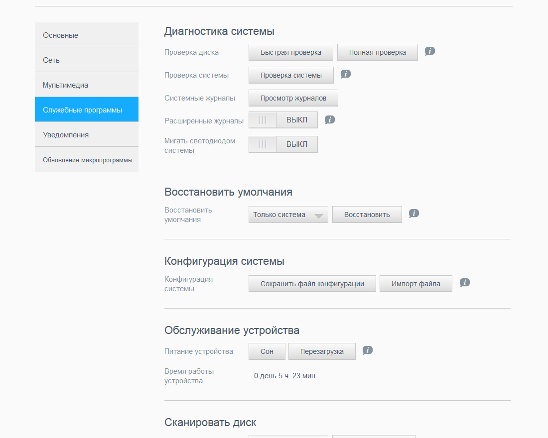 По дизайну веб-интерфейс не отличается от использующегося в других устройствах этого производителя. В верхней строке мы видим несколько значков: статус внешних USB-устройств, уведомления, справка, пользователь. Под последним скрываются операции выхода, перезагрузки и перехода в режим сна. Отметим, что явной возможности для выключения питания накопителя в прошивке этой модели мы не обнаружили. Полезной функцией является и встроенная возможность отправки обращения в техподдержку, включающего отчет о состоянии устройства.
