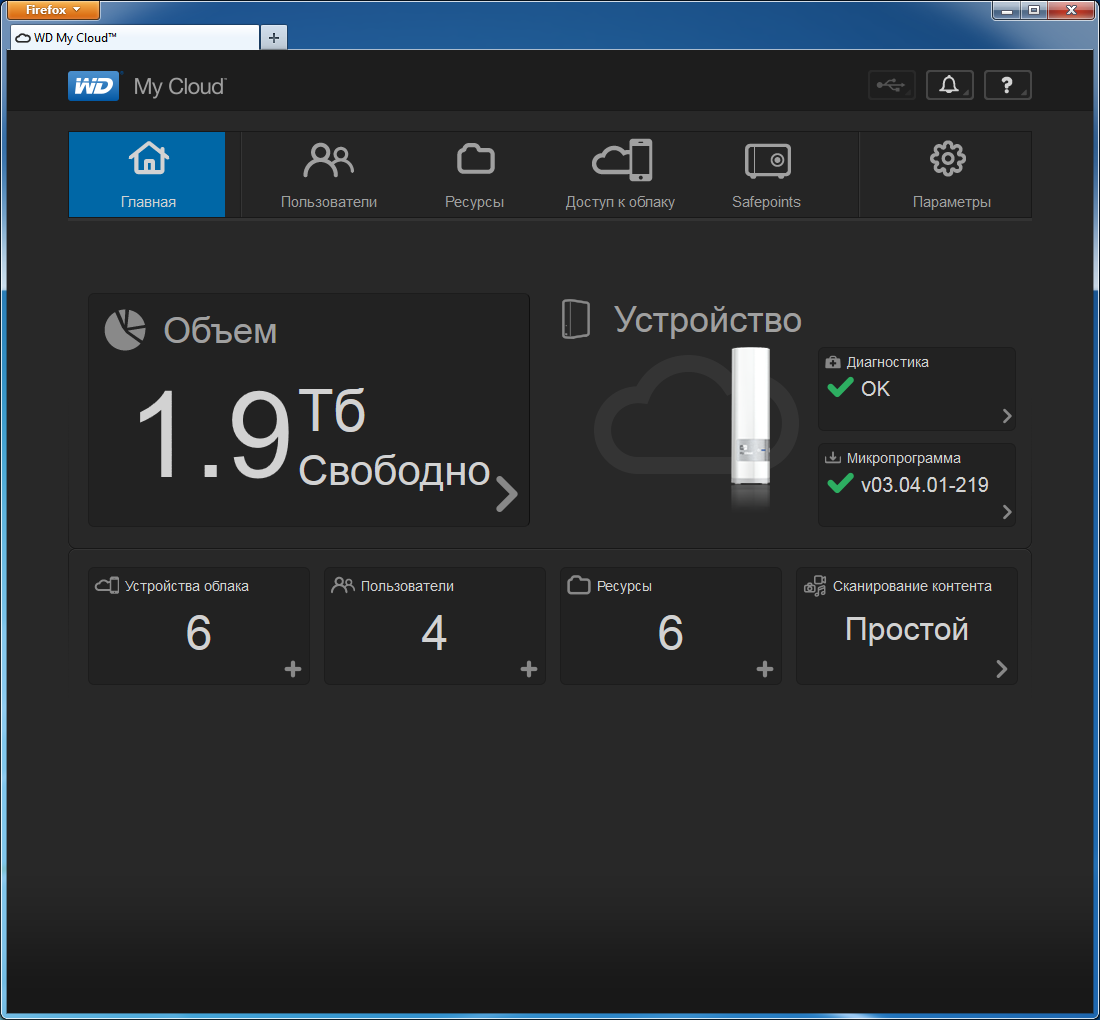 На стартовой странице пользователю доступна основная информация о состоянии накопителя, включая свободный объем, обобщенный результат диагностики, данные о числе пользователей и общих ресурсов. С большинства пунктов есть ссылки на соответствующие страницы с расширенными данными (например, распределению записанных файлов по типу).