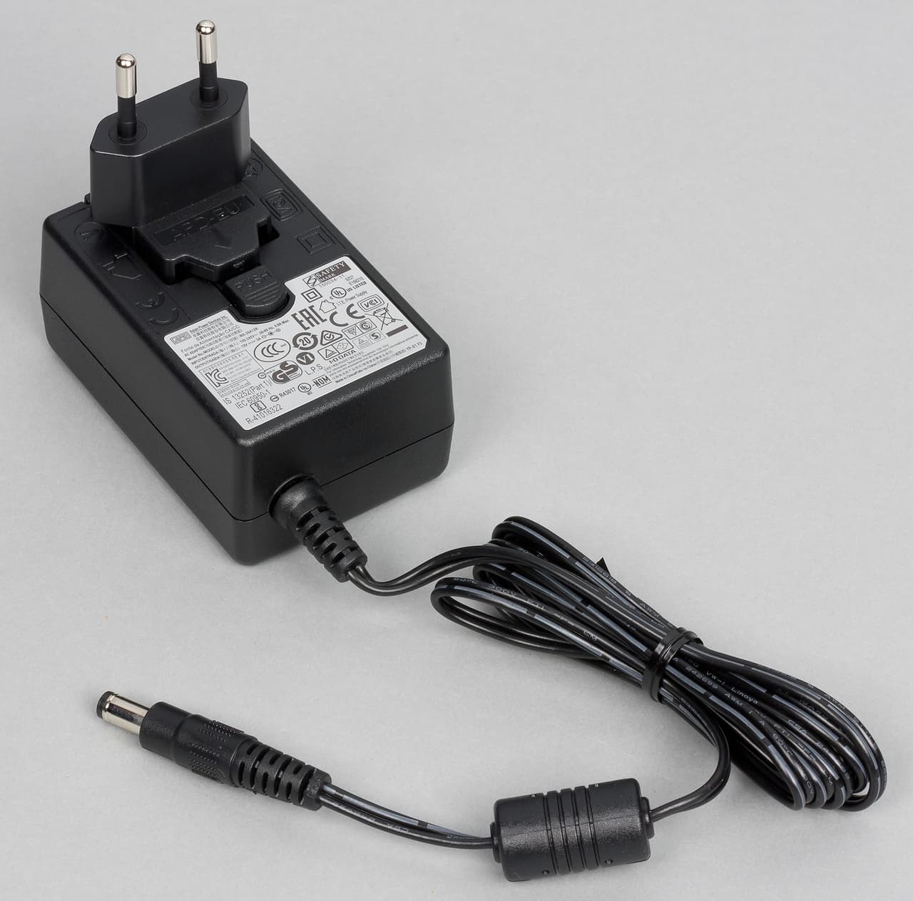Внутри коробки в толстых защитных вставках находится сам накопитель (напомним, что модель поставляется с винчестерами и усиленная защита здесь востребована) и коробка с блоком питания, кабелем для подключения к локальной сети и несколькими бумажными документами. Блок питания имеет «розеточный» формат и параметры 12 В 3 А. Кроме того, он поддерживает сменные вилки для разных регионов.