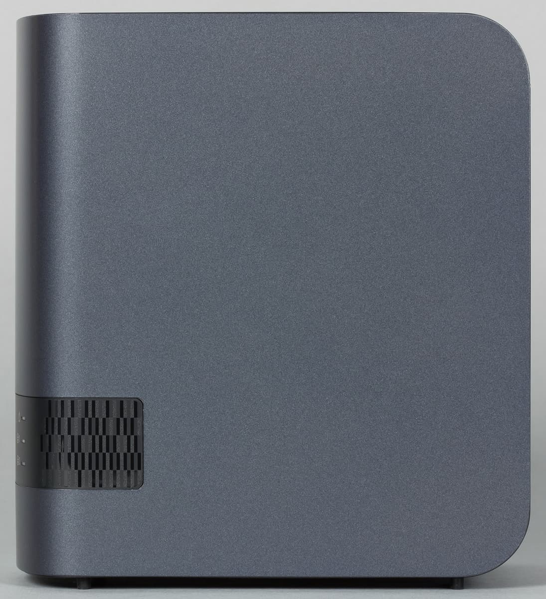На передней панели присутствует блок с тремя многоцветными индикаторами — статуса системы и состояния дисков. Расположены они на черной вставке, которая также содержит и название устройства. Никаких портов или кнопок с этой стороны не предусмотрено.
