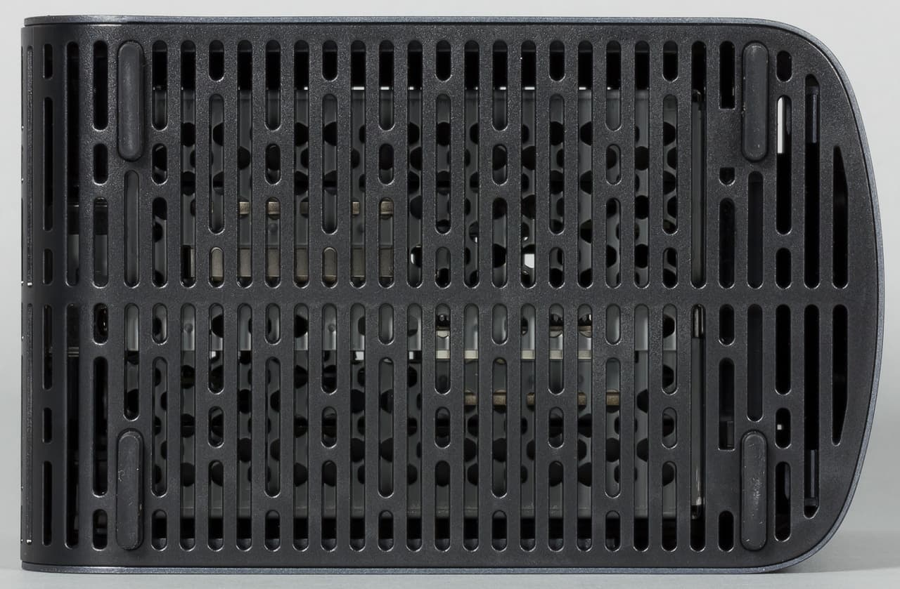 На дне находятся четыре резиновые ножки, а все остальное пространство используется как решетка вентиляции. Верхняя панель корпуса является крышкой для дисковых отсеков и также покрыта отверстиями системы вентиляции.