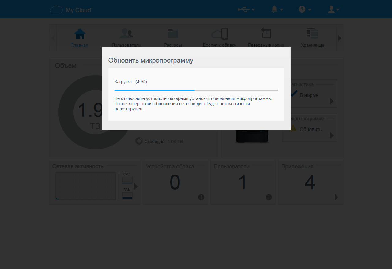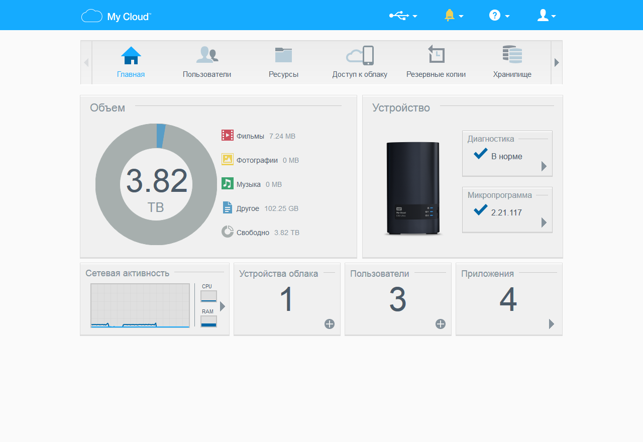 На стартовом окне представлена ключевая информация о работе устройства, включая статистику дискового пространства, состояние аппаратных датчиков, наличие обновлений для прошивки, нагрузку на сеть, процессор и оперативную память, число пользователей и приложений.