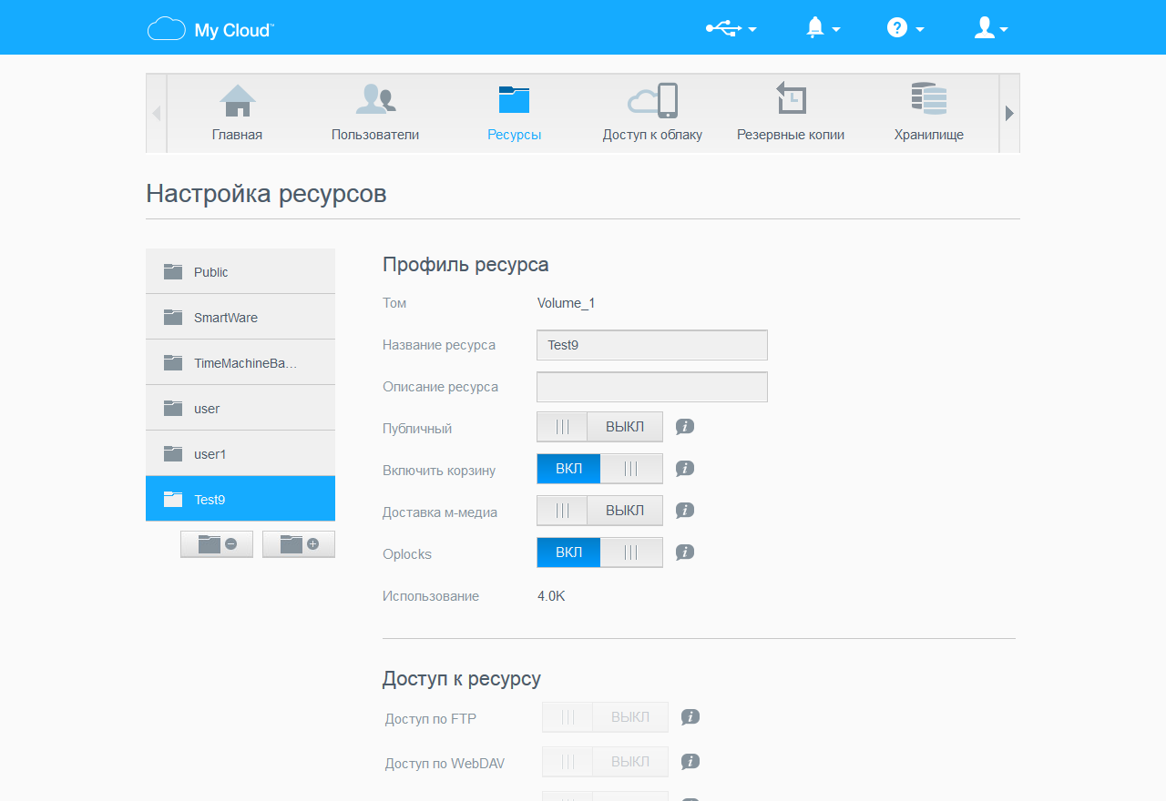 На существующих томах можно создавать любое число общих папок (ресурсов). Для каждого из них указываются индивидуальные права доступа, а также дополнительные опции — корзина для удаленных файлов, индексация файлов медиасервером, доступ по дополнительным протоколам и другие. Заметим, что для работы с данными на внешних дисках можно использовать не только SMB, но и другие протоколы, а также управлять правами доступа.