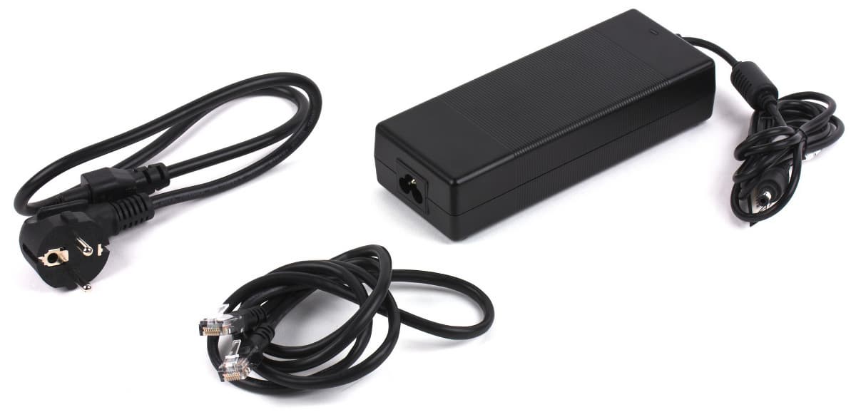 В комплект поставки входят сетевой адаптер (19 В 4,7 А) с кабелем, сетевой патч-корд и листовка с кратким описанием начала работы с устройством. Отметим, что блок питания имеет «ноутбучный» разъем силового кабеля, что встречается относительно редко.