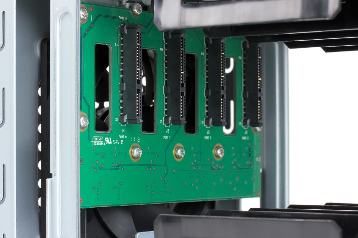 Дисковые отсеки являются и основным способом поступления воздуха в систему охлаждения устройства. Дополнительно присутствуют небольшие решетки на боках крышки корпуса.