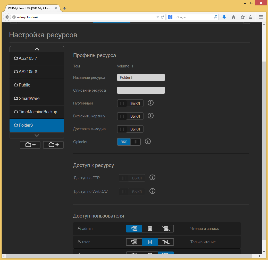 На странице «Ресурсы» администратор системы может запрограммировать требуемое число общих папок. В параметрах каждой можно включить доступ без ограничения прав, установить права для каждого пользователя, включить корзину для удаляемых файлов, включить индексацию для мультимедиасервера, разрешить доступ по протоколам FTP и WebDAV. Отметим, что по умолчанию система создает общедоступную папку «Public», которую нельзя удалить и нельзя изменить ей права, что не всегда удобно. Также после настройки первого дискового дома будут созданы общие ресурсы SmartWare и TimeMachineBackup, которые ведут себя аналогично.