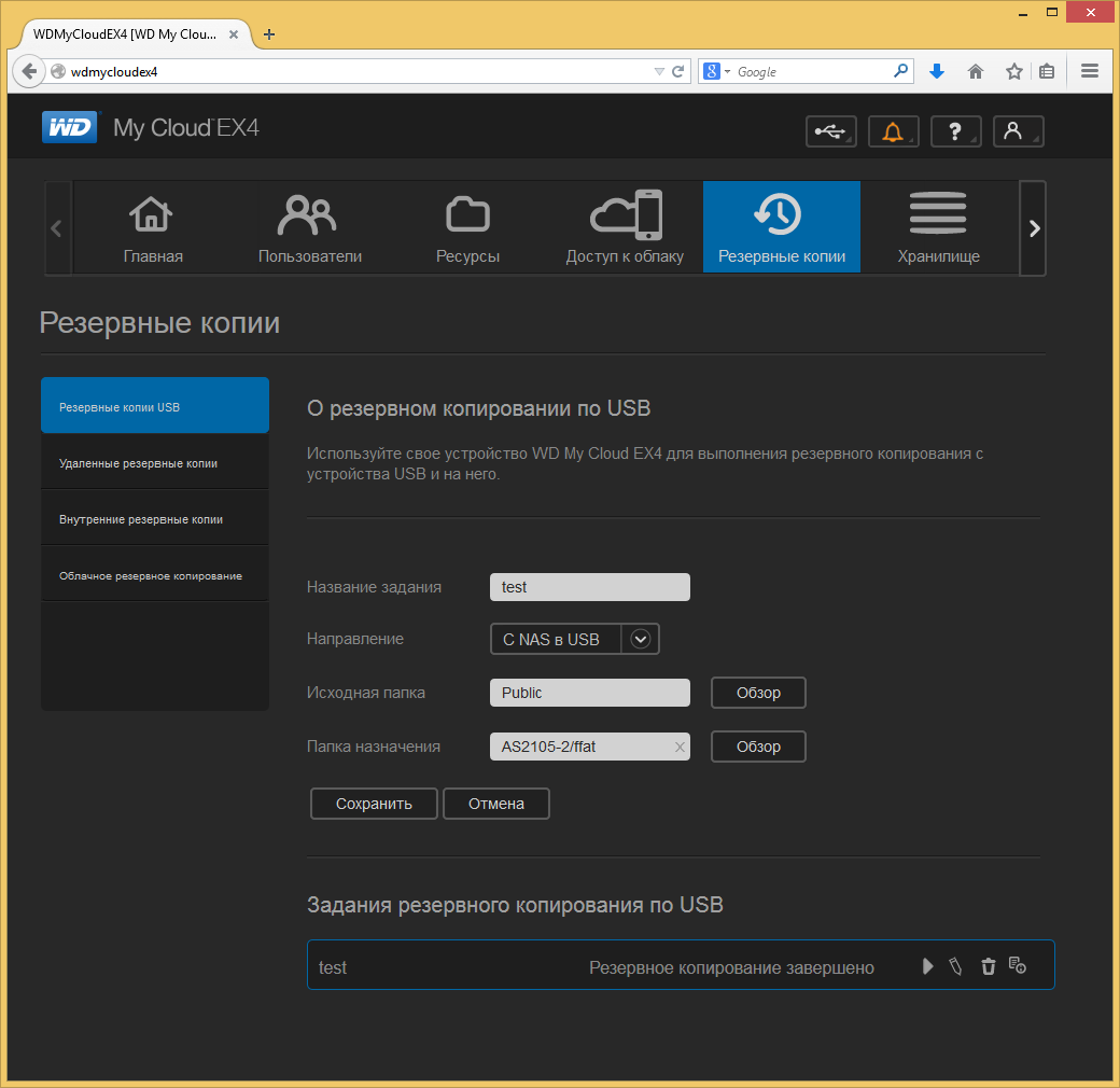 Позаботился производитель и о резервном копировании данных с самого сетевого накопителя. Для реализации данной задачи можно использовать внешние USB-диски (к сожалению, в этом сценарии не поддерживается расписание), удаленные устройства WD My Cloud, копирование внутри устройства и облачные хранилища Elephant Drive и Amazon S3.