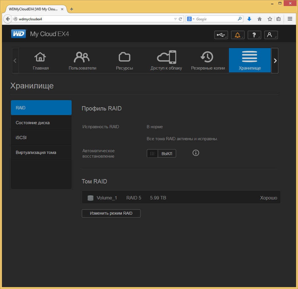 Управление дисковыми разделами сделано не очень удобно. Пользователю не дали возможность гибкой конфигурации, что для четырехдисковой модели наверняка будет востребовано многими потребителями. Устройство поддерживает работу с одиночными дисками, JBOD, RAID0/1/5/10. Для отказоустойчивых массивов можно заранее указать диск для автоматической замены в случае отказа одного из основных винчестеров. В устройстве предусмотрены некоторые варианты миграции без потери данных, например, из одиночного диска в зеркало и из зеркала в массив с чередованием. Для хранения данных используется файловая система EXT4. Объем служебных разделов составляет около четырех гигабайт. Отметим, что поддерживается шифрование томов, однако на данной платформе оно не имеет практического смысла, поскольку производительность снижается в несколько раз.