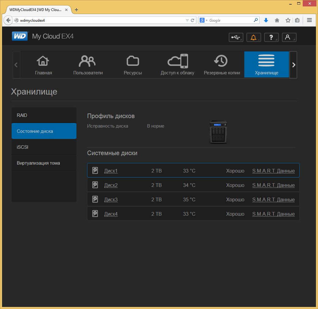 Внешний вид меню настройки аналогичен младшей модели WD My Cloud. На первой странице после входа пользователь видит основную информацию о работе накопителя: общий свободный объем результат последней диагностики, версию прошивки, загруженность сети, процессора и оперативной памяти и другие данные. С каждого элемента есть ссылка на более детальную информацию. Например, статистика по типам данных, температура дисков и системы, скорость вращения вентилятора, список процессов.