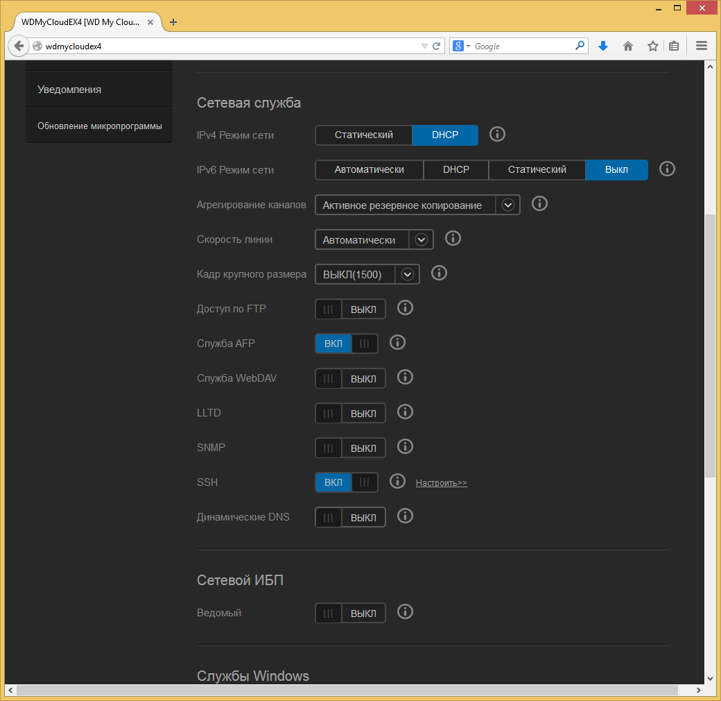 В сетевых настройках устройства можно изменить IP-адрес сетевой карты, выбрать режим работы двух сетевых соединений (в том числе резервирование, объединение или балансировку нагрузки), включить протоколы FTP, AFP, WebDAV и другие. Отметим, что есть возможность доступа к консоли операционной системы по протоколу SSH. Для сетевых служб ОС Windows можно изменить название рабочей группы, включить режим локального обозревателя, выбрать версию протокола SMB, использовать распределенную файловую систему и подключиться к Active Directory. Сервер FTP имеет опции по выбору номеров портов, ограничению числа подключений и скоростей, включению шифрования и фильтр IP-адресов клиентов. Отметим, что поддержки протокола NFS в устройстве мы не обнаружили.