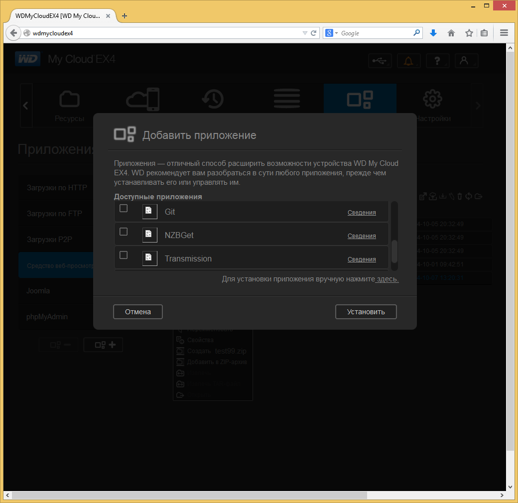 В этом же разделе находится кнопка для добавления новых приложений из официального каталога производителя. На момент написания статьи в нем были представлены следующие программы: aMule, IceCast, Joomla, phpBB, phpMyAdmin, SqueezeCenter, WordPress, Git, NBZGet, Transmission и DVBLink. Отметим также наличие в устройстве сервера MySQL, который требуется некоторым приложениям. Наиболее интересным здесь будет, пожалуй, Transmission, имеющий в этот раз открытый собственный полноценный веб-интерфейс с доступом ко всем настройкам. Отметим, что есть возможность установки программ и не из официального каталога, а в виде готовых пакетов сторонних разработчиков, а также обновления программ при выходе новых версий.