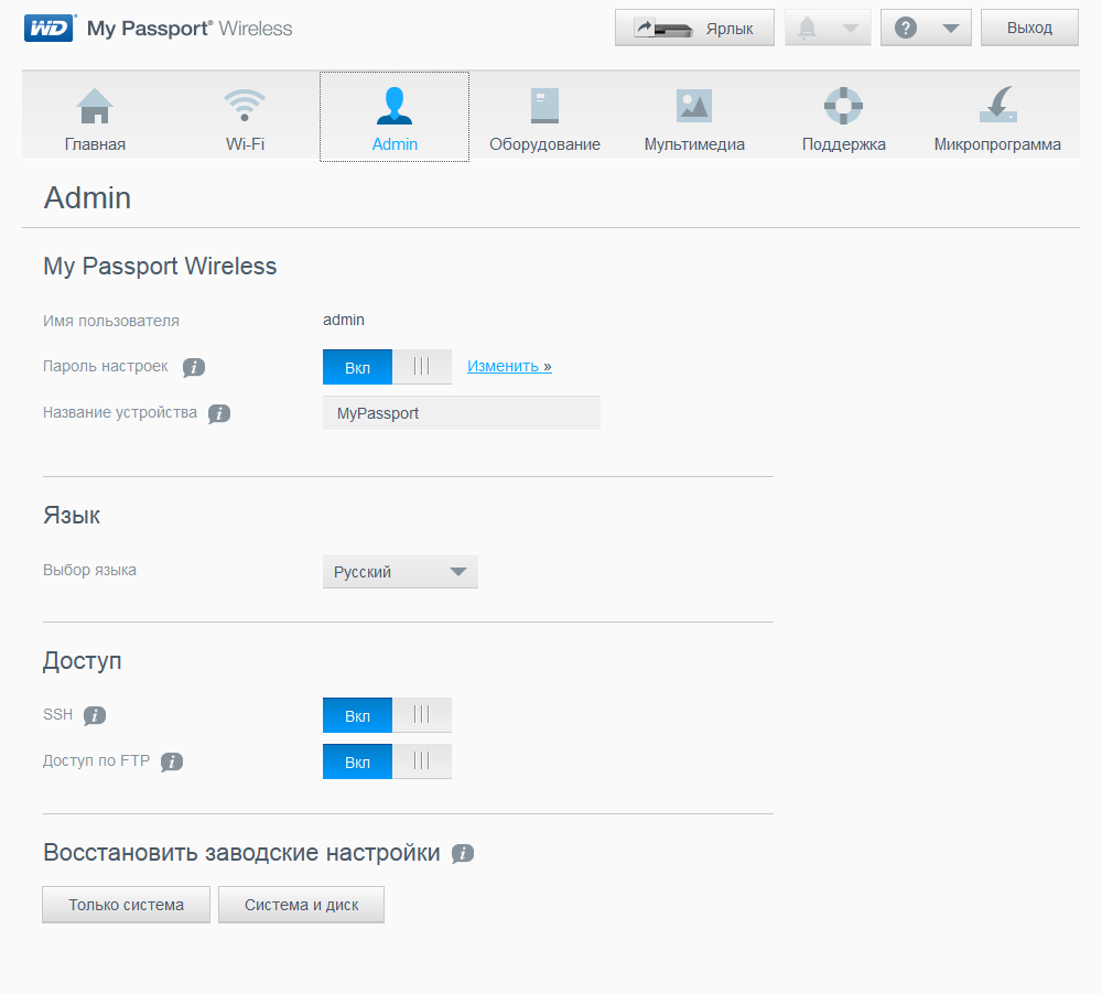 Для беспроводного подключения поддерживается одновременная работа с пятью клиентами. По умолчанию устройство создает открытую беспроводную сеть с именем MyPassport. После подключения к ней и открытия веб-интерфейса по адресу http://mypassport или http://192.168.60.1 первым действием (точнее, вторым — после принятия лицензионного соглашения) предлагается изменить имя и установить пароль для защиты сети. Именно веб-интерфейс предоставляет возможность изменить все параметры работы устройства. Мобильная программа WD My Cloud имеет доступ не ко всем из них.