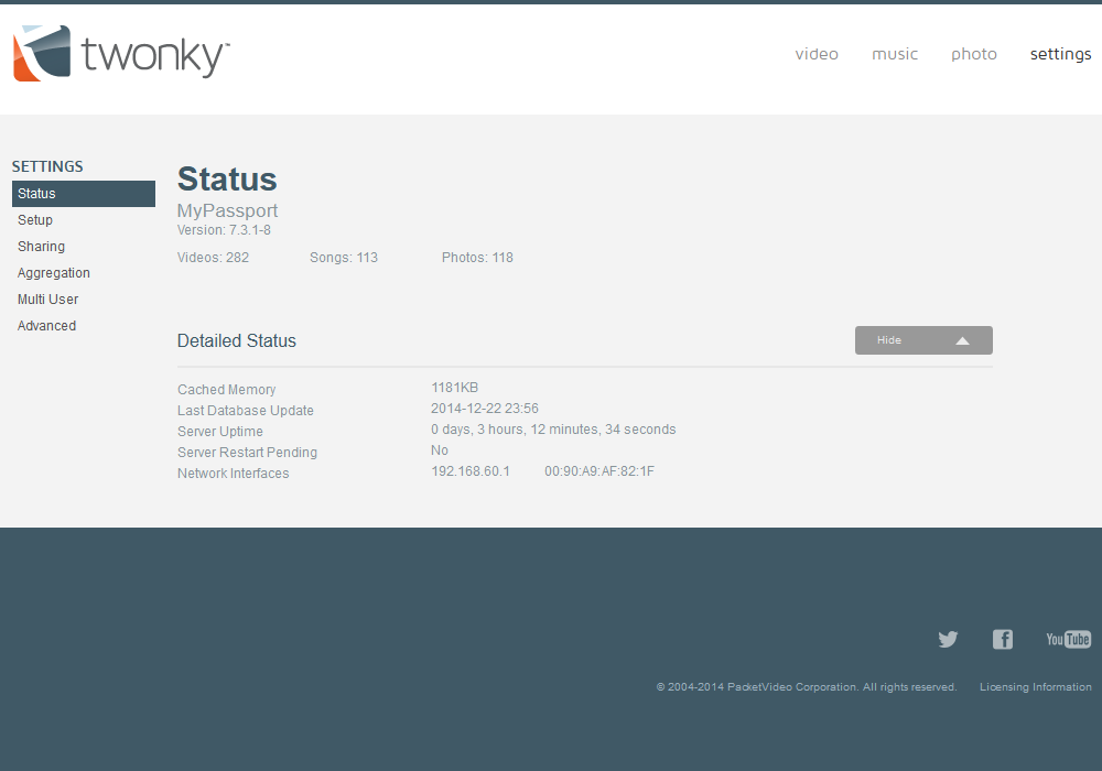Встроенный сервер DLNA, реализованный на базе известного продукта TwonkyMedia, может пригодиться для работы с такими клиентами, как Smart TV и игровые приставки. В нем поддерживается большинство современных форматов мультимедиа для индексации, включая JPEG, PNG, MP3, WMA, FLAC, M4A, AAC, AVI, MKV, WMV, M2TS, MOV, MP4, TS. Реализована сортировка файлов по виртуальным папкам на основании метаданных, включая года для фотографий и теги для музыки. Отметим, что доступен собственный веб-интерфейс сервера DLNA, который работает на стандартном порту 9000.