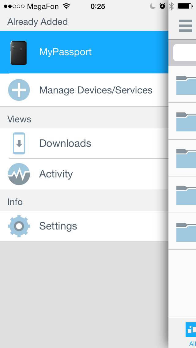 После подключения к беспроводной сети устройства, накопитель автоматически появляется в меню программы. Как и с семейством My Cloud, пользователю доступны некоторые операции над файлами и папками, включая поиск, удаление, копирование, изменение имени, скачивание на мобильное устройство, загрузка файлов на накопитель (в iOS — только фотографий и видеороликов из галереи).
