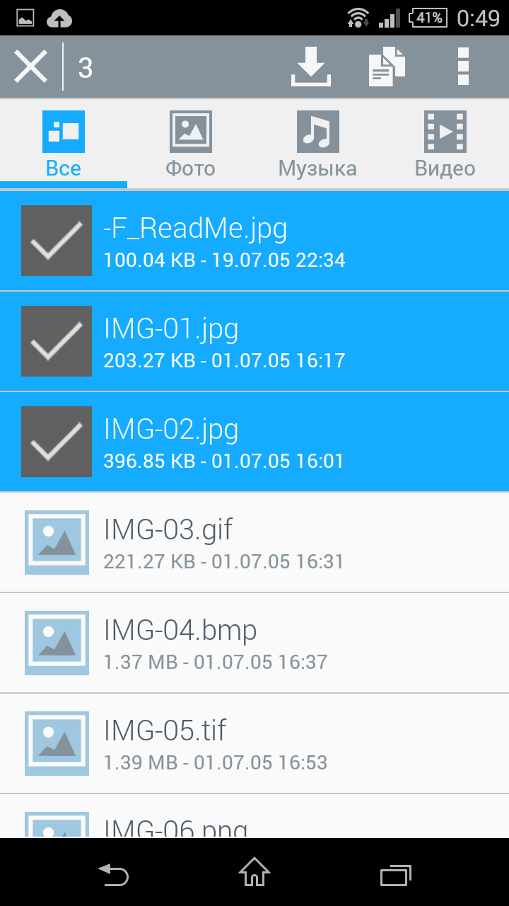 Кроме навигации по папкам, предусмотрено использование создаваемыми устройством виртуальным папкам с сортировкой по типу медиафайлов и некоторым тегам. Версия утилиты для планшета (проверялась на Android) не использует больший размер экрана, что, конечно, не очень удобно.