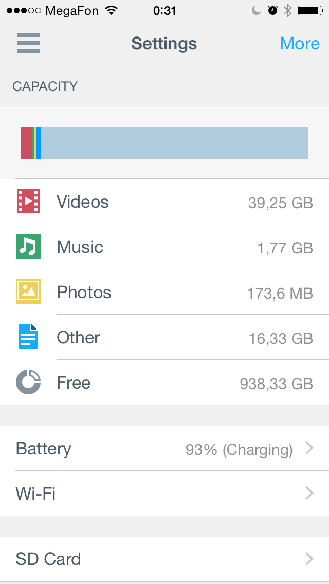 Далее идет полоса со значками для основных групп меню настроек. Страница «Главная» отображает текущий статус устройства — объем диска, занятое определенными типами файлов пространство, уровень заряда батареи, режим беспроводного подключения, версия прошивки и другие данные.
