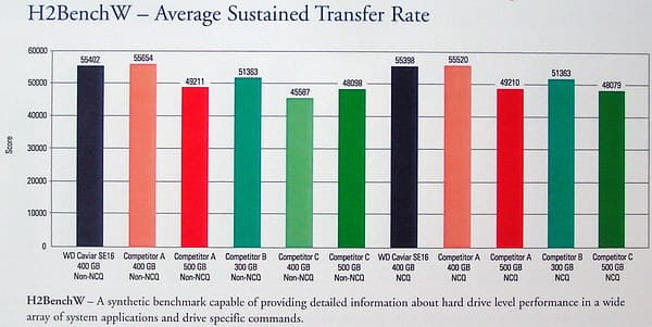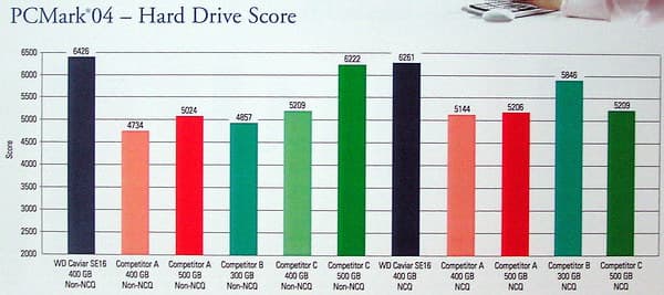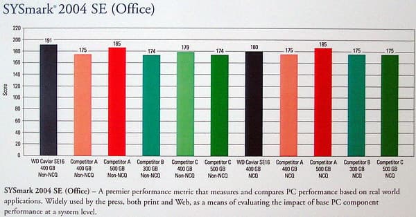 Примерно одновременно с выходом этих дисков в WD был поднят вопрос о целесообразности использования NCQ в дисках для персональных компьютеров. Дело в том, что исследования дисков конкурентов нередко демонстрировали почти полное безразличие быстродействия накопителей при выполнении типичных задач настольного компьютера к тому, работает NCQ или нет. А в ряде случаев даже оказывалось, что с NCQ накопитель работает в этих задачах медленнее, чем без нее! В лабораториях WD провели собственные исследования нового диска WD4000KD при работе с NCQ и без NCQ. И вот что получилось.