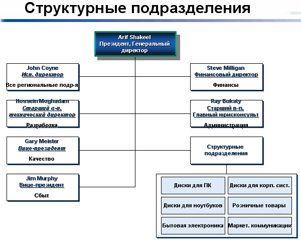 Попутно отметим, что недавно у WD сменился президент. Новым руководителем корпорации стал Ариф Шакил (Arif Shakeel), который раньше был здесь операционным директором. Основное изменение, которое он привнес — разделение на функциональные подразделения компании по сегментам рынка (см. блок-схему).