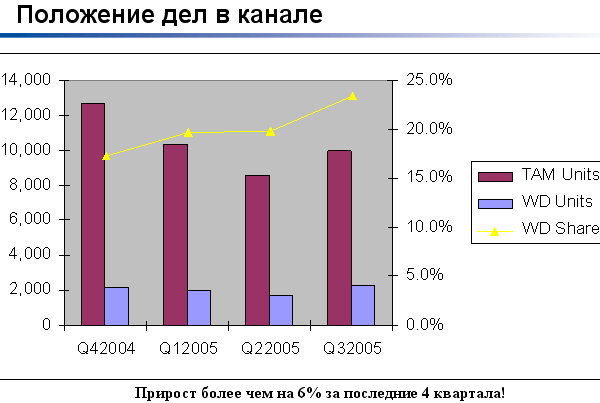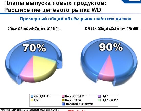 Итоги деятельности WD в первом квартале нового финансового года (закончившегося 30 сентября 2005 календарного года) действительно впечатляют: выручка компании в первом квартале составила 1 млрд. долларов, объём сбыта — примерно 17,1 млн. единиц продукции (то есть дисков), а чистый доход — 68,8 млн. долларов или 0,31 доллара на одну акцию с учетом 4,6 млн. долларов расходов на приобретение опционов. Валовая прибыль в отчётном квартале составила 17,7%, а на вырученные и освободившиеся средства WD выкупила примерно 1,1 млн. своих акций на общую сумму примерно 14 млн. долларов. Таким образом, с момента начала программы выкупа акций в мае 2004 года компанией было выкуплено примерно 7,8 миллиона своих акций на общую сумму примерно 75 млн. долларов. В нынешнее нелегкое время, когда большинство конкурентов еле сводят концы с концами, такие показатели — это достижение. И они в немалой мере обусловлены высоким спросом на рынках настольных ПК, ноутбуков и PVR/DVR — в первом квартале текущего финансового года компания отгрузила производителям ноутбуков, работающим на самом стремительно развивающемся в отрасли массовом рынке, более 1 миллиона 2,5-дюймовых жёстких дисков WD Scorpio для мобильных устройств. Кроме того, она реализовала примерно 1,3 миллиона 3,5-дюймовых жёстких дисков производителям персональных и цифровых устройств видеозаписи (PVR/DVR). По сведениям WD, 25% выручки в первом квартале она получила от сбыта товаров, не относящихся к рынку настольных ПК, таких как ноутбуки, бытовая электроника и системы корпоративного класса, а также от розничной торговли. Другие 75% квартальной выручки были получены от сбыта накопителей на жёстких дисках, устанавливавшихся в настольные ПК. Уровень спроса на продукцию WD на данном рынке по-прежнему остаётся стабильно высоким. Для сравнения, в аналогичном квартале прошлого года доля выручки из источников, не относящихся к настольным ПК, составляла 20%, а доля выручки от сбыта жёстких дисков для настольных ПК — 80%.