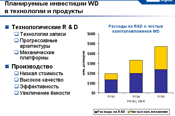 Western Digital своими продуктами сейчас способна принять участие в развитии 90% рынка накопителей, то есть те немногие сегменты, где эта компания не имеет своих предложений — это дорогие корпоративные SCSI/FC-диски и накопители форм-факторов 1,8- и 0,85-дюйма. Благоприятная финансовая ситуация позволяет WD утроить свои инвестиции в исследования и разработки, а также увеличить капиталовложения. Основные труды WD по развитию сосредоточены сейчас в направлениях, перечисленных на рисунке.