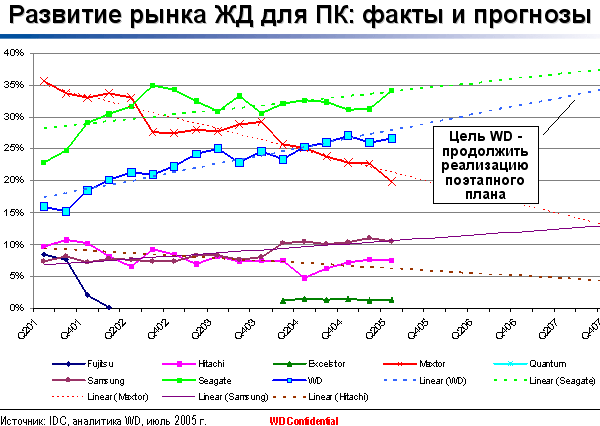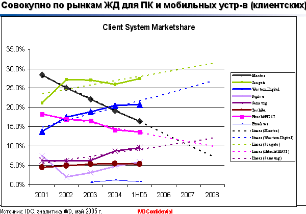 хотя аппетиты компании, выражающиеся в «линейно экстраполированных» кривых роста (пунктир на графике), тоже наполеоновские. В общем, типичный пример работы корпоративных отделов планирования, хотя у WD на это все же есть определенные объективные причины.
