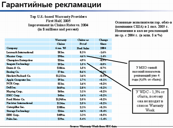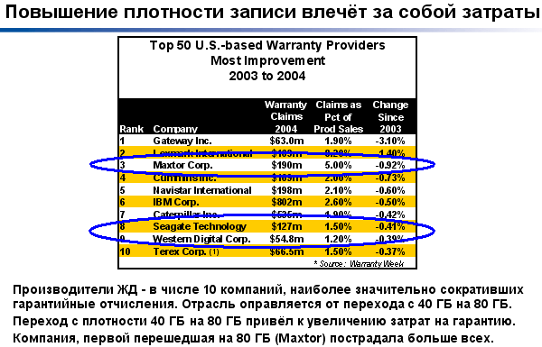 Очень высокий процент (4,6%) у Maxtor, 1,5% у Seagate и лишь 1,3% у WD. Это процент, который компании отчисляют на поддержку по гарантии. Причины неудач Maxtor, по мнению WD, — что они слишком быстро (самыми первыми три года назад) перешли на новую плотность записи 80 Гбайт на пластину.