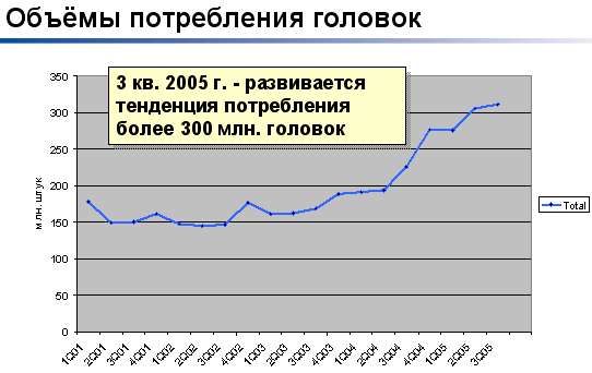 Динамика потребления головок для HDD в целом по отрасли такова, что на протяжении почти трех лет (с 2001 по 2004) количество ежеквартально устанавливаемых головок почти не увеличивалось. Это было связано с тем, что в это время плотность записи на пластины росла ударными темпами, и потребность в увеличении емкости моделей дисков удавалось покрывать за счет меньшего количества пластин/головок! Однако с приходом 80-гигабайтных пластин ситуация явно изменилась — плотность записи не росла почти 2 года, и в этих условиях (2004-2005 годы) компаниями пришлось «вспоминать» свои многопластинные модели, то есть количество потребляемых головок стало быстро расти, всего за год увеличившись почти в полтора раза — с 200 до 300 миллионов штук в квартал! И пока что не видно причин, по которым потребление головок может стабилизироваться.