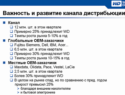Помимо традиционного «настольного» направления своей деятельности WD особенно выделяет поставки WD Scorpio (для ноутбуков и переносных устройств), диски для PVR/DVR и игровых приставок, новое для себя направление 1-дюймовых накопителей, а также отдельную категорию SATA-дисков для многопользовательского окружения (то есть корпоративных применений) — она растет тоже достаточно быстро.