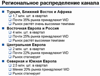 Кратко пробежимся по локальным (региональным) интересам и стратегии WD. Компания постепенно увеличивает число своих сотрудников в России и смежных регионах (сейчас у WD самое большое представительство в Москве среди всех производителей жестких дисков). Планируется открыть новые сервис-центры и центры сбора в России, Дубаи, ЮАР, Германии и Венгрии, перейти от одного-двух дистрибьюторских каналов к нескольким партнерским (собственно, в России это уже сделано), в том числе, в регионах нашей страны.