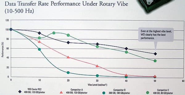 Интересно и другое измерение, проведенное WD на специальном оборудовании также при помощи IOMeter. На графиках показано, как меняется быстродействие дисков при наличии внешней вибрации (ее величина отложена по горизонтали, за 100% взято быстродействие дисков в покое).